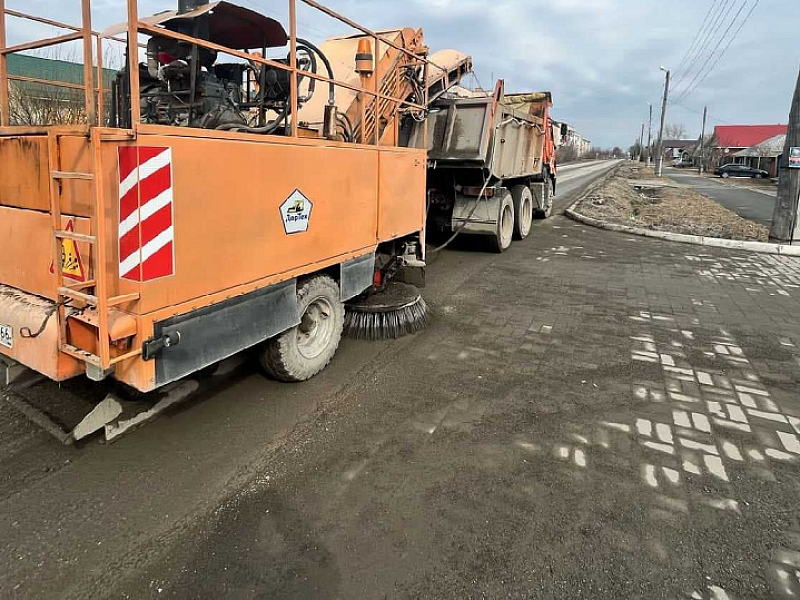 Специальная машина увлажняет дорогу и наваливает кучи мусора